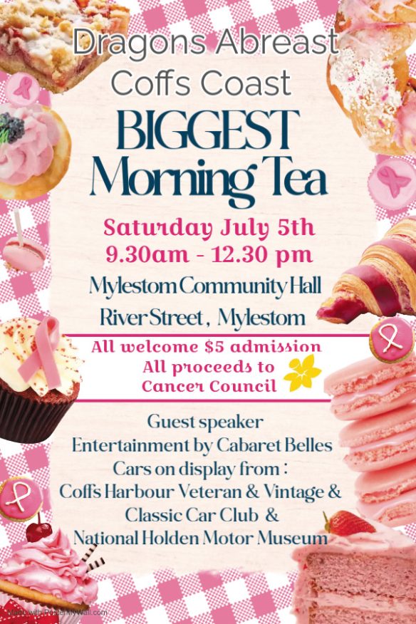 Dragons Abreast Coffs Coast is hosting a Biggest Morning Tea at the Mylestom Community Hall, River Street, Mylestom to raise money for the Cancer Council.