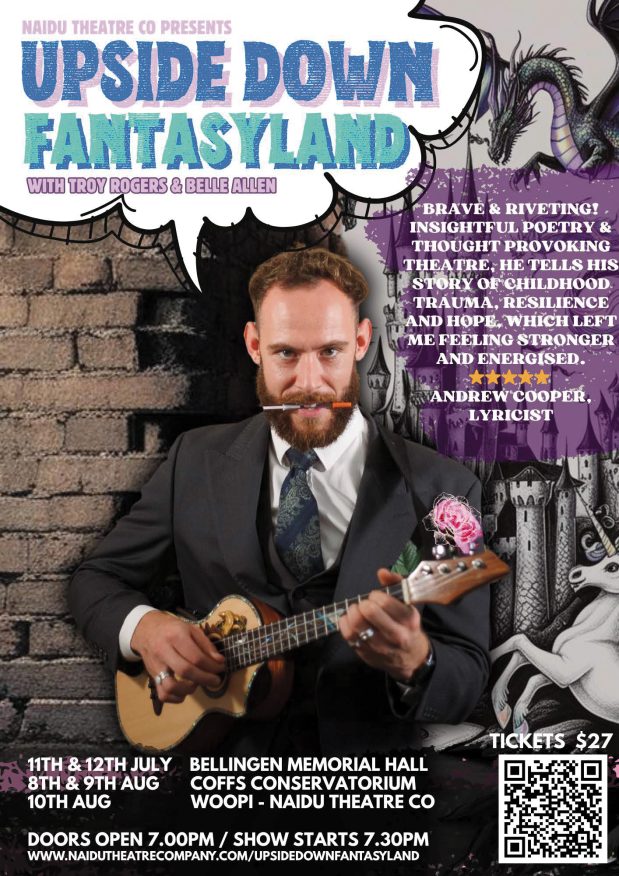 Recently toured at Sydney Fringe, Adelaide Fringe & Newcastle Fringe, (as well as a sold-out show in Bellingen in April) Upside Down Fantasyland is coming to the Mid North Coast with a limited run of intimate shows.