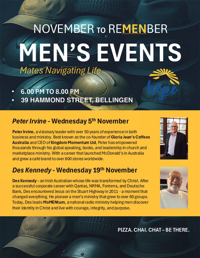 An Irish-Australian whose life was transformed by Christ, Des walked away from a successful corporate career with Qantas, NRMA, Fonterra, and Deutsche Bank after a life-changing encounter on the Stuart Highway in 2011. Since then, he has pioneered a men’s ministry that has grown to over 60 groups and now leads MoMENtum, a national radio ministry helping men find identity and courage through faith.