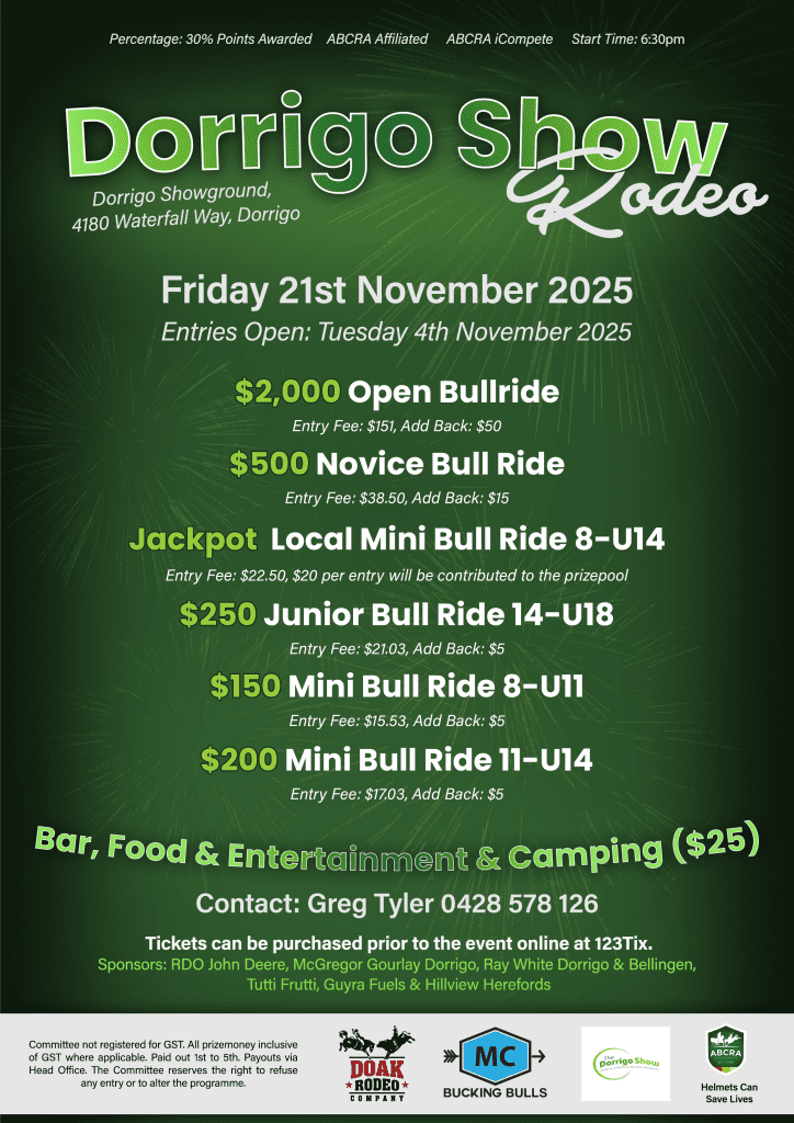 Get ready for one of the most exciting nights on the local calendar — the 2025 Dorrigo Show Rodeo, happening 7pm Friday, 21st November at the Dorrigo Showground. This high-energy event is the perfect way to finish the first day of our Show, combining heart-stopping rodeo action with a fun, family-friendly atmosphere that everyone can enjoy.