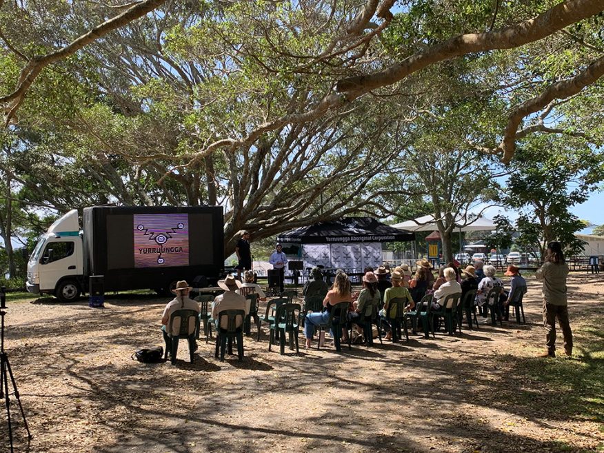 The Mylestom community consultation featured cultural presentations, open discussions, and expert insights from across environmental, cultural, and scientific fields. The free family-friendly event had free community BBQ, giving locals a chance to share stories and ideas in a relaxed and inclusive setting. Local community organisation stalls added to the event’s success, offering valuable information and engagement opportunities for attendees across a range of environmental and cultural programs and services. The Yurruungga Aboriginal Corporation stall displayed large maps outlining the boundaries of the proposed Indigenous Protected Area to help community members visualise the proposed Indigenous Protected Area.