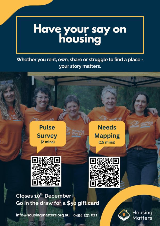 The Housing Matters Action Group Inc (HMAG) is calling on residents across the Bellingen Shire to take part in two new community housing surveys – designed to capture local experiences, challenges, and hopes for a fairer housing system.