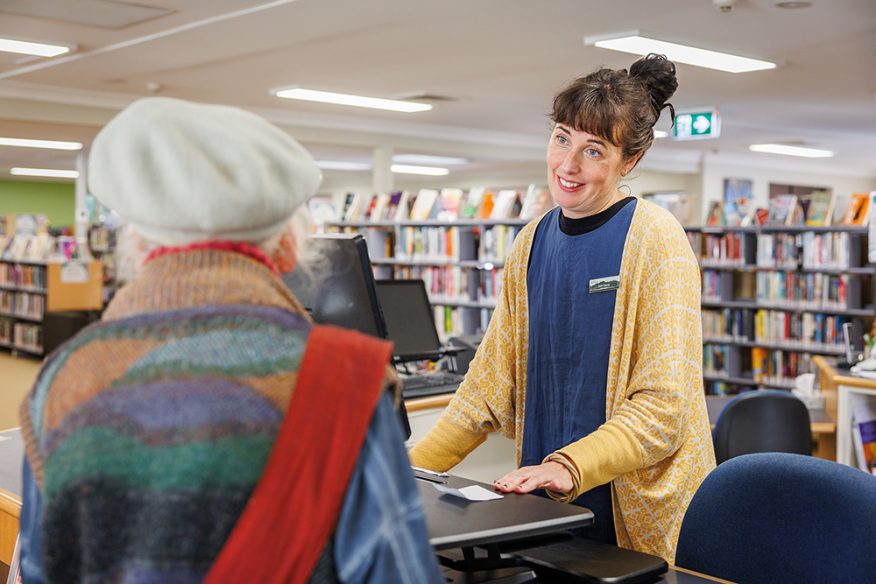 Bellingen Shire Librarian Jade Tsang, with a library user at Bellingen Library